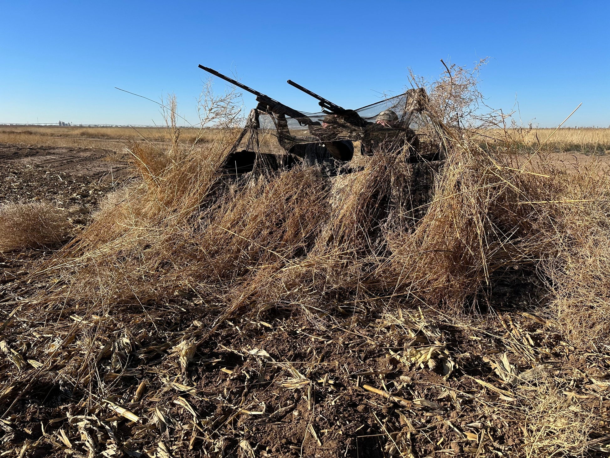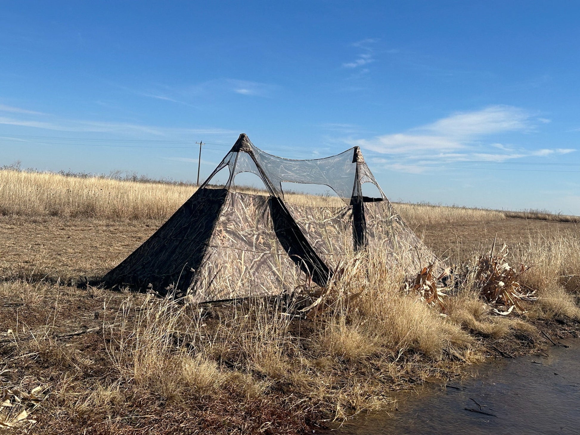 Crafted from durable 150 Denier Nylon, this panel features a mesh top with a convenient shooting window that rolls up for easy storage. The reinforced top corner pockets and bottom bracket ensure a secure setup, while the stubble straps and stake loops allow for added camouflage brush to make the perfect waterfowl setup.